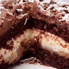 Utilizando um aro de 24 cm de diâmetro, inicie a montagem do bolo intercalando um disco de massa levemente regado com a calda de chocolate, espalhe por cima toda a Ganache de Coco, outro disco de massa regada, Creme Prestígio e finalize com o último disco de massa regada.