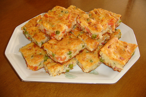 Numa forma retangular untada e enfarinhada,despeje metade da massa,espalhe o recheio e depois espalhe o resto da massa.