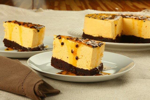 Coloque o creme de chocolate sobre a massa já assada. Acrescente o creme de maracujá. Cubra com o espelho de maracujá.