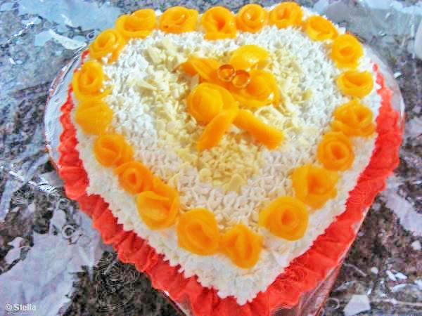 Além de lindo, este bolo fica delicioso! Ele tem um recheio de creme de confeiteiro diferente e que leva creme de leite, por cima, pedacinhos de pêssego em calda picados! Você pode, como na foto, confeitar com chantilly!
