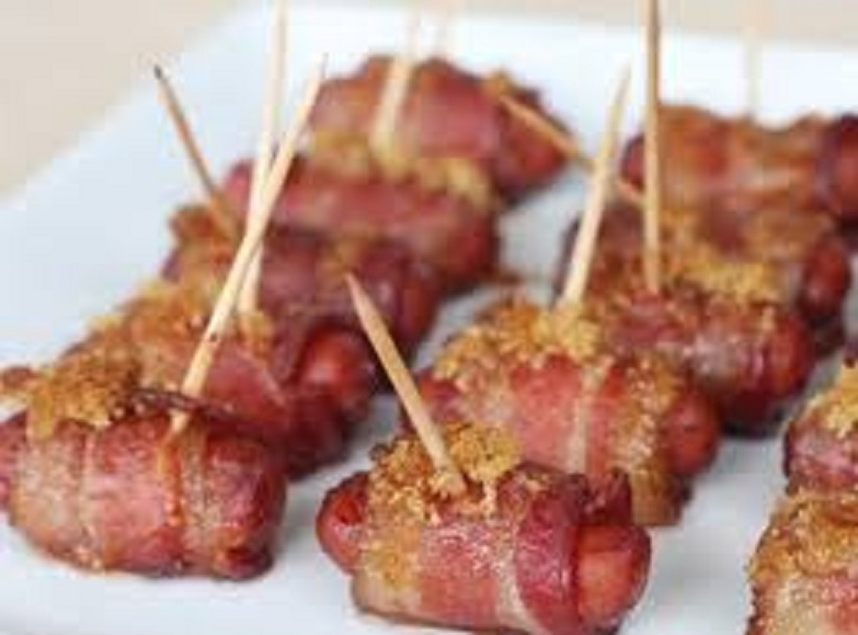 Passe no ovo e na farinha, depois pegue a tira de bacon enrole na salsicha de uma ponta a outra e prenda com o palito