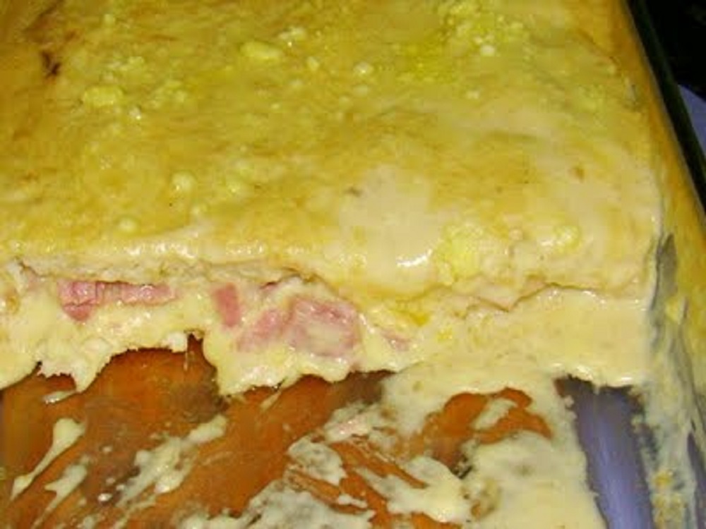 Monte o pirex assim: pão, creme, queijo e presunto. Repita até o final. Termine com pão e creme. Polvilhe o queijo ralado e leve ao forno alto até gratinar.