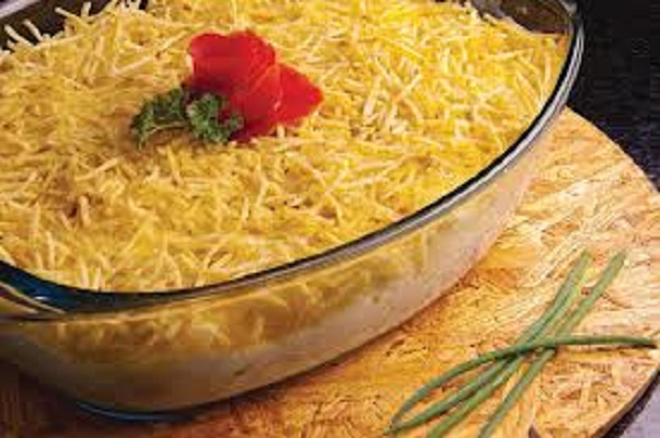 Coloque o refogado numa assadeira, cubra com mussarela e espalhe a batata palha por cima