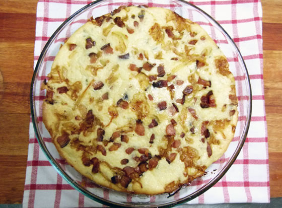 3. Quando a assadeira untada estiver quente, tire-a do forno com cuidado, ponha o creme de ovos preparado, salpique com o bacon e espalhe a cebola por toda a superfície. Leve ao forno por 30 minutos ou até a massa estar dourada e levemente estufada. Sirva imediatamente.