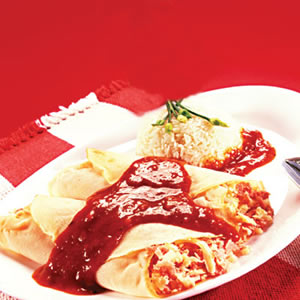 Pegue as panquecas, coloque uma fatia de mussarela e uma porção de carne e enrole
