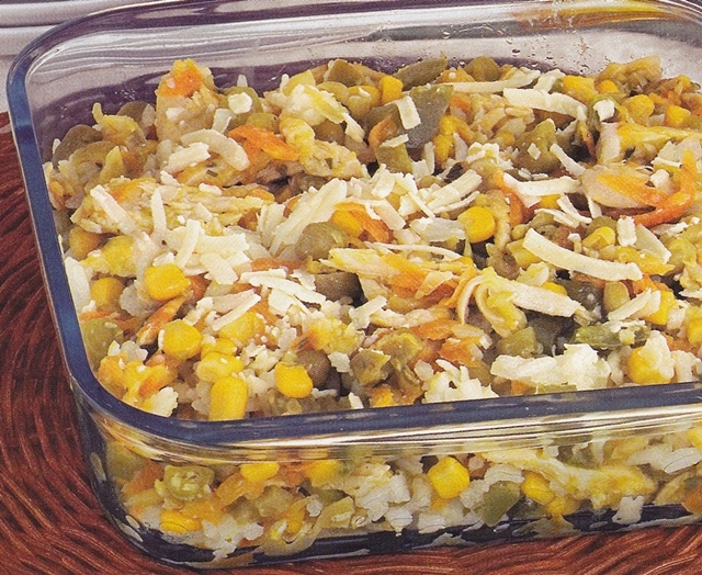 Em uma panela, leve ao fogo médio a manteiga e a cebola por 3 minutos ou até dourar levemente, mexendo de vez em quando.Acrescente o milho, a cenoura e refogue por 5 minutos.Adicione a vagem, o pimentão,o caldo de galinha,o cheiro-verde,a azeitona ,a ervilha, o peito de frango e refogue por mais 5 minutos .Retire do fogo, acrescente o arroz, o queijo e misture bem.Coloque em um refratário e sirva em seguida.
