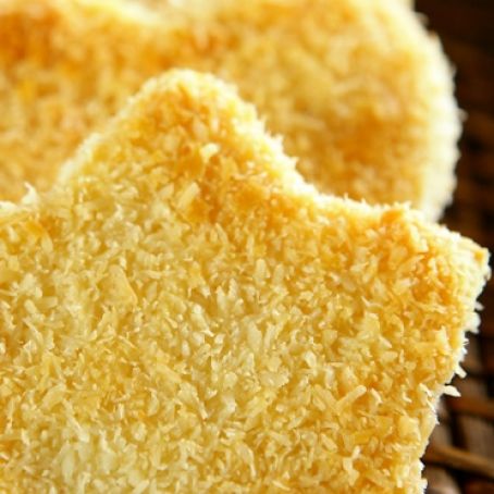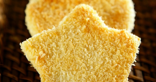 Passe no coco e recorte em quadrado ou com cortadores de biscoito.