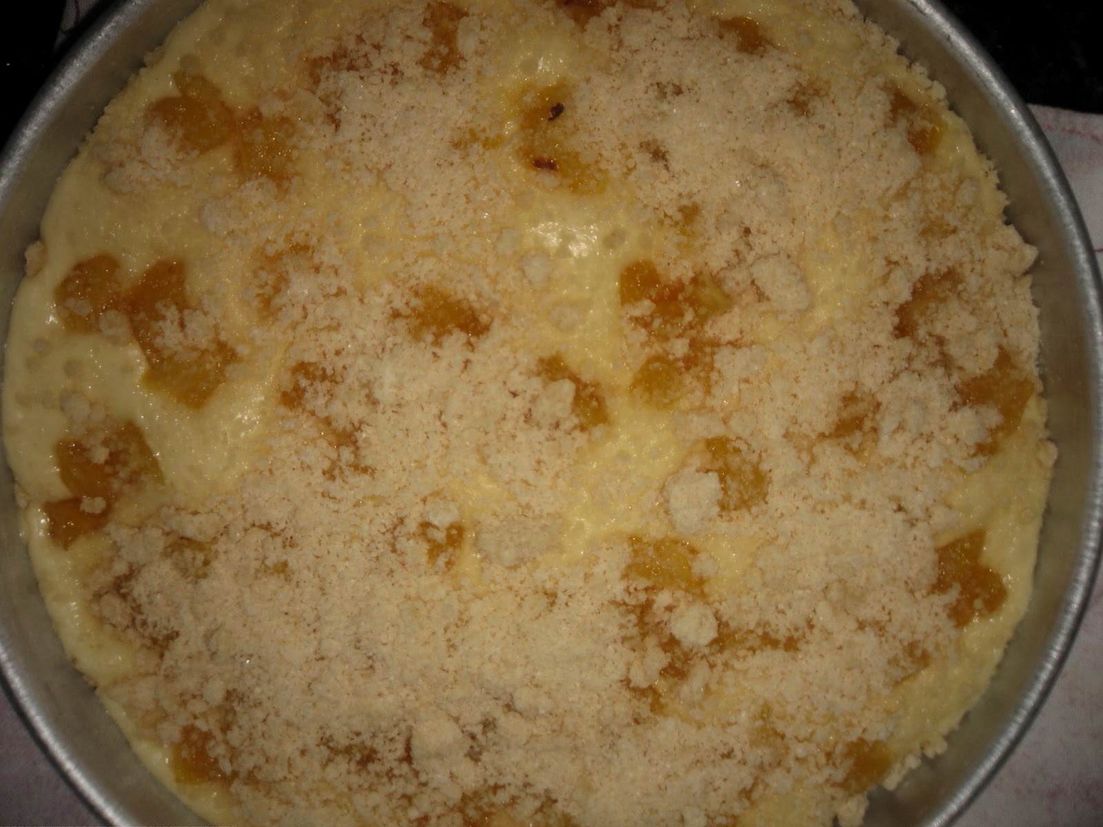 Mistura-se os ingredientes da farofinha e coloca-se por cima do abacaxi.