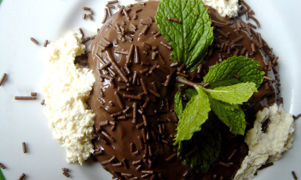 Com o auxílio de uma colher de sorvete, coloque uma porção no centro de um prato de sobremesa, enfeite com folhas de hortelã e chocolate granulado.
