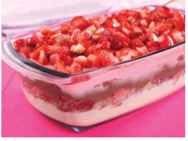 Bata as claras em neve, coloque no creme anterior já frio e misture delicadamente. Espalhe bastante morangos picados por cima. Reserve.