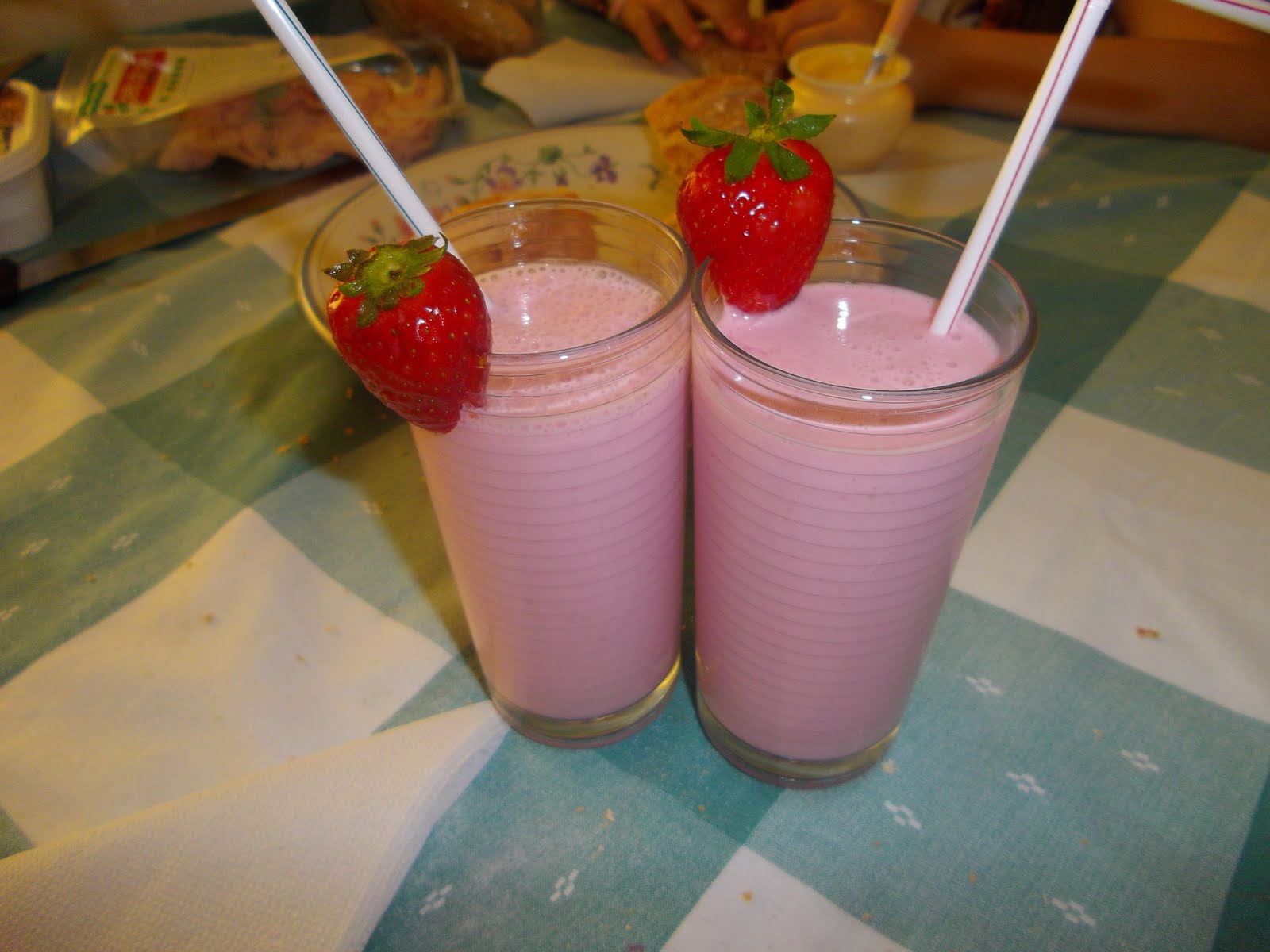 Bata o iogurte e os seis morangos picadinhos no liquidificado, adoce a gosto, depois de pronto misture pedaços de morango no copo e beba.