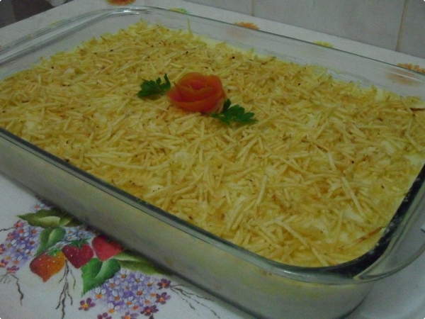 Fazer uma camada de pão de fôrma, uma de recheio, pão de fôrma, purê, batata palha.