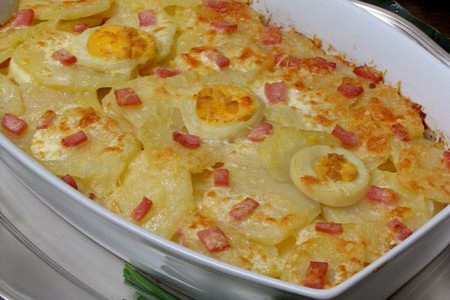 queça o óleo e frite o bacon até que fique bem dourado. Acrescente a cebola e o alho e refogue bem. Junte o tempero e o caldo de legumes dissolvido em 3 colheres (sopa) de água fervente. Reserve. Rale a batata no ralo grosso e misture imediatamente ao molho pronto. Unte um refratário (médio) com óleo, acrescente metade da batata, uma parte do requeijão cremoso (reservando um pouco para a cobertura), e o restante da batata. Cubra com o requeijão, polvilhe com o queijo parmesão ralado. Leve ao forno médio (180°C) por aproximadamente 20 a 25 minutos ou até que a batata esteja macia. Sirva a seguir.