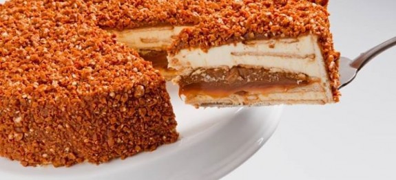 Desenforme em uma bandeja redonda, cubra com doce de leite e salpique por cima o crocante.