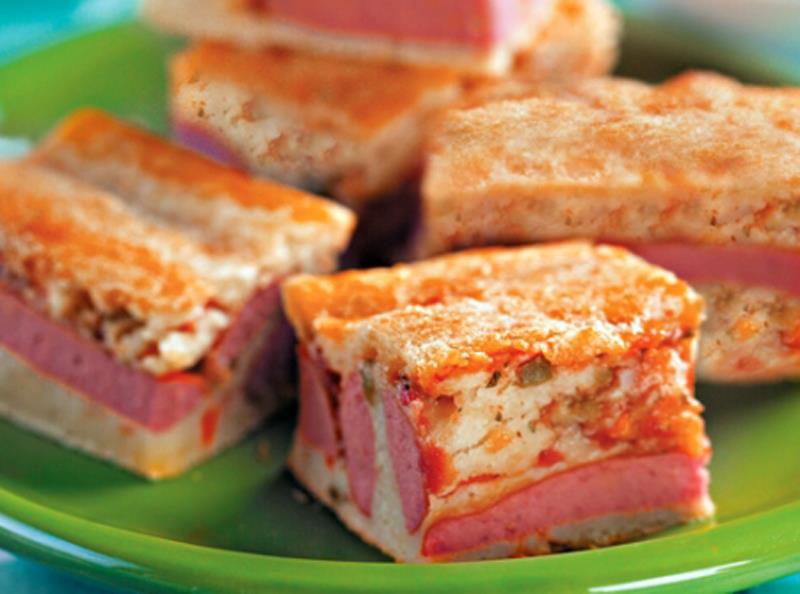 Unte com margarina um refratário, ponha metade da massa, espalhe o molho frio e distribua as salsichas. Cubra com restante da massa e leve para assar durante 40 minutos ou até dourar.