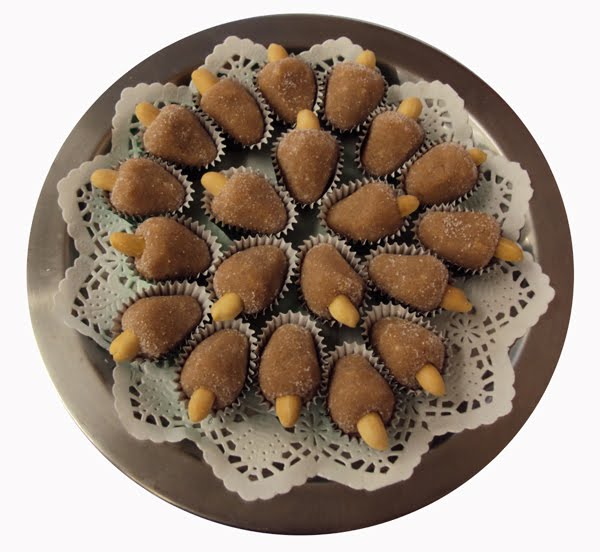 modele-os com um formato de um caju,polvilhe-os no açúcar e coloque o amendoim.