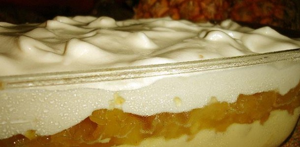 Junte o leite condensado as gemas e a mesma medida de leite e leve ao fogo brando até engrossar. Coloque em refratária. Quando estiver frio coloque por cima o doce de abacaxi, distribuindo uniformemente.