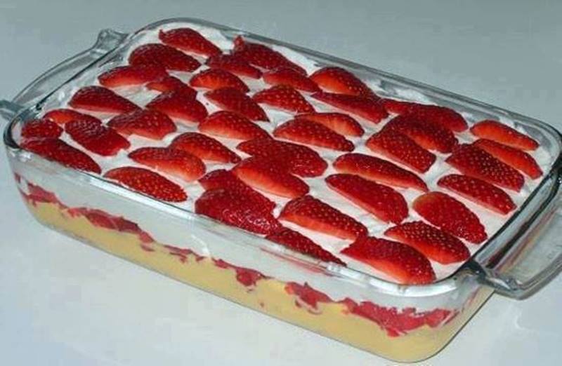 Uma camada de biscoitos bem úmidos, metade dos morangos picados, o creme de manteiga, outra camada de biscoitos, o restante dos morangos picados e por último, o chantilly.