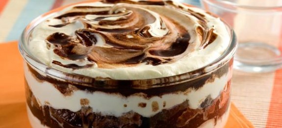 Em taças ou em um refratário, alterne camadas de biscoitos umedecidos na calda de chocolate e camadas de creme. Por cima despeje o que restou da calda. Leve para gelar no mínimo 3 horas.