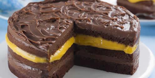 Coloque o terceiro disco e cubra com o restante do creme de chocolate. Sirva o bolo gelado.