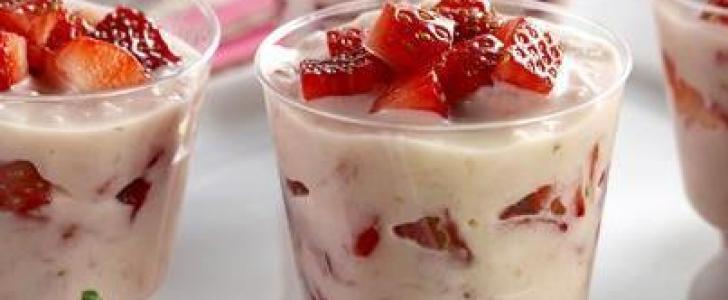 4. Distribua em copinhos e leve a geladeira. Decore com morangos picados.