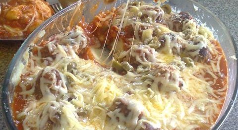 Por cima as almôndegas com o molhos e por último o queijo e o orégano.
