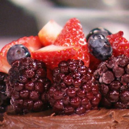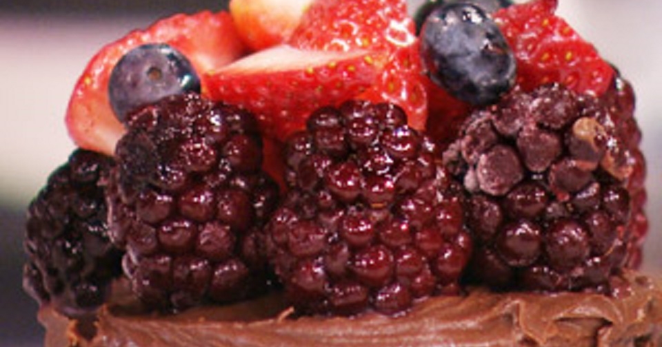 Corte o bolo ao meio e recheie com a ganache e um pouco das frutas vermelhas.