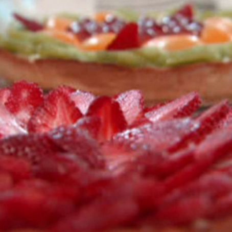 Disponha as fatias de morango sobre o creme de confeiteiro, formando uma espiral em volta do diâmetro da torta.