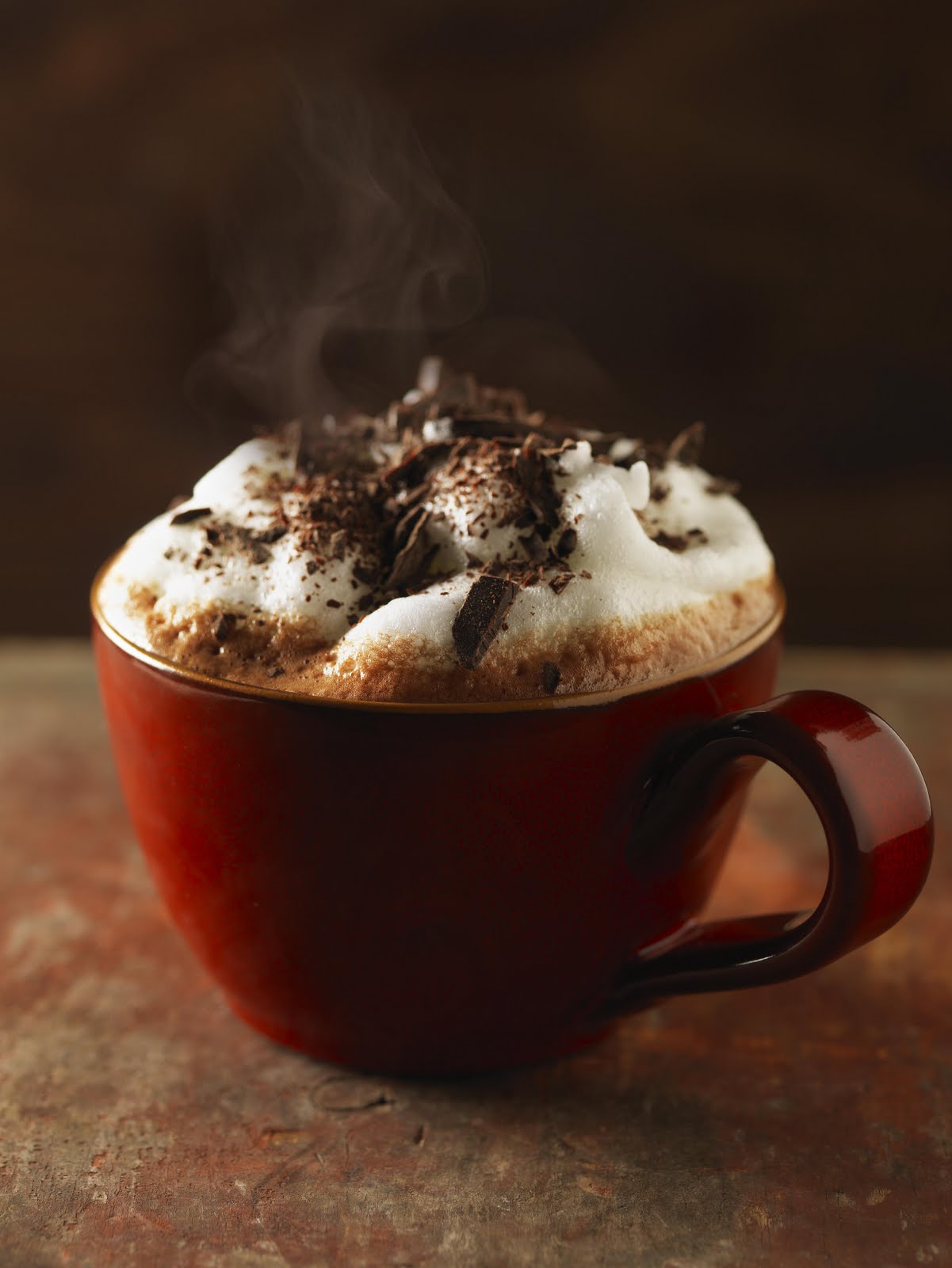 Coloque o chocolate quente em uma caneca, cubra com o chantilly, polvilhe com a canela em pó e decore com as raspas de chocolate