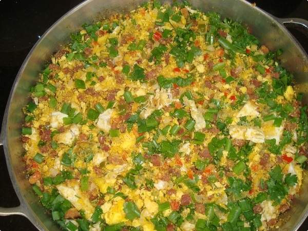 deixando sempre a panela fechada para não secar os legumes. quando estiver bem passados, acrescente as frituras misturando bem. vai adicionando aos pouco a farinha de milho até ficar bem homogêneo. Por último a cebolinha bem picada.