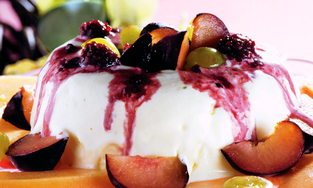Bata dois ovos inteiros e três gemas com o açúcar de baunilha até formar um creme fofo. Junte as raspas e o suco de limão. Mexa e reserve. Acrescente o iogurte e misture bem. Bata o creme de leite em ponto de chantilly e incorpore delicadamente o creme de iogurte. Reserve. Bata em neve as três claras restantes e junte ao creme de iogurte com chantilly. Despeje em uma forma forrada com filme plástico e leve ao freezer por cerca de quatro horas. Desenforme gelado sobre um prato. Espalhe as frutas picadas na superfície e em volta. Regue com a calda de morango e sirva em seguida.