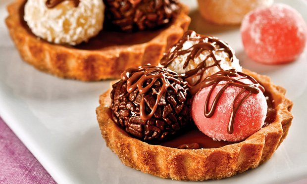 4. Prepare o creme: derreta o chocolate em banho-maria e misture o creme de leite. Deixe esfriar e coloque uma camada fina sobre cada tortinha. Leve à geladeira até firmar.