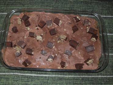 Em um prato monte camadas alternadas de creme e bis picado. Em cima cubra com uma cobertura de chocolate