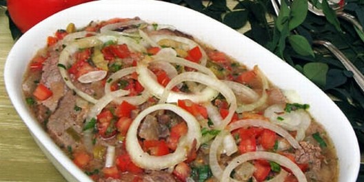 Leve ao fogo a água em que o lagarto foi cozido e acrescente o óleo, a cebola, o alho, o louro, o tomate bem picadinho, sal e pimenta a gosto. Deixe ferver bem, Quando estiver quase pronto junte os picles, a azeitona e deixe no fogo par mais uns 3 minutos. Tire do fogo e acrescente o vinagre e o cheiro verde. Misture bem.