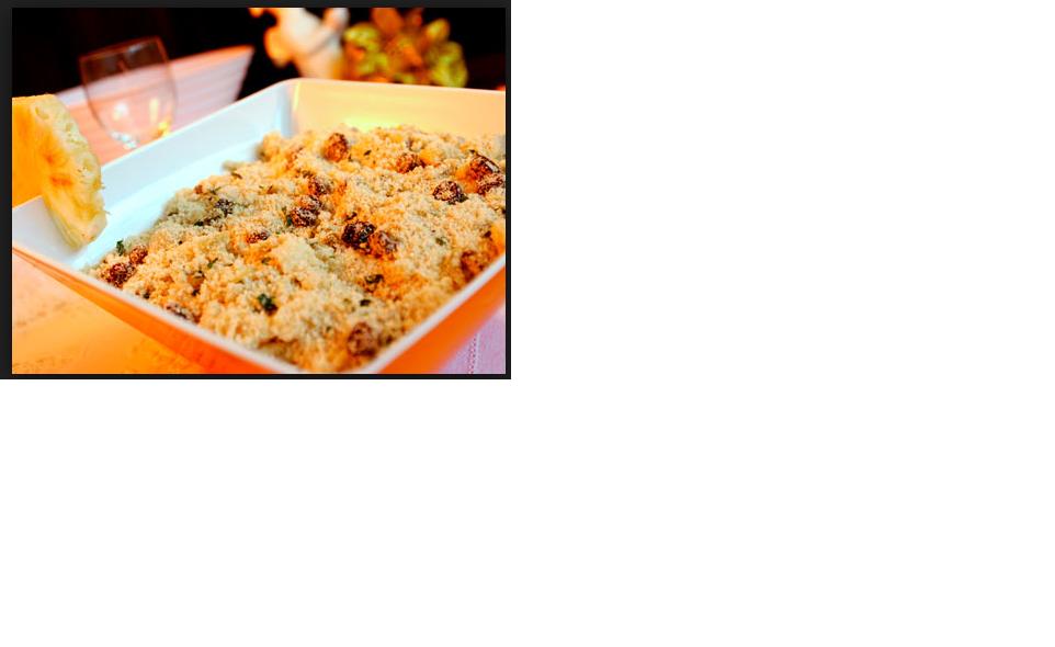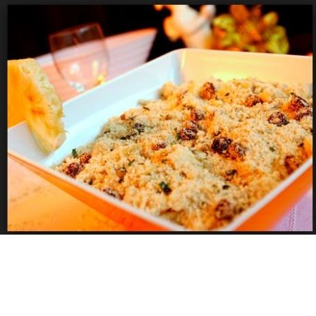 4 - Distribua 50 g de manteiga em cubinhos, 1 xícara (chá) de cebola picada e 1 xícara (chá) de bacon picado e leve ao forno médio pré-aquecido a 180° C por +/- 35 minutos. Retire do forno, misture a farofa e sirva em seguida.