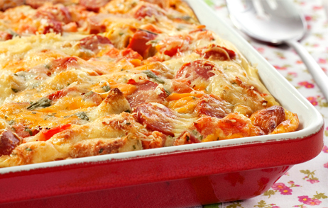 - Distribua a salsicha, o tomate, o queijo e os pães picados e regue com a mistura de ovos. - Polvilhe o queijo parmesão, as ervas e cubra o refratário com um plástico-filme.