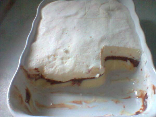 Bata as claras em neve, e com cuidado coloque o açúcar e o creme de leite, misture devagar. Coloque por cima do chocolate e deixe 2 horas no congelador.