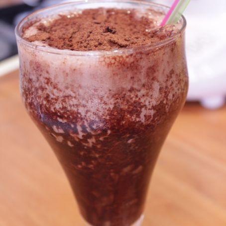 Bata no liquidificador o sorvete de chocolate com o leite, por alguns instantes, mantendo uma consistência cremosa. Tome cuidado para que não fique ralo. Decore a taça com a cobertura de chocolate e acrescente a bebida. Sirva imediatamente.