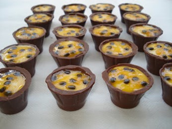 Coloque num refratário raso e com o auxílio de uma colher adicione o musse dentro dos copinhos. Por último corte ao meio o maracujá que restou, tire as sementes e enfeite os copinhos.