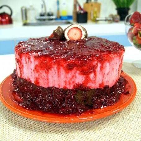 em um aro, coloque a massa e espalhe um pouco da geléia para umedecer. Coloque sobre a massa, a mousse já cremosa. Leve para gelar por aproximadamente duas a três horas.Pegue o restante da geléia de morango e acrescente a gelatina hidratada. Retire do aro do bolo e cubra-o com essa géleia. Decore com morangos.