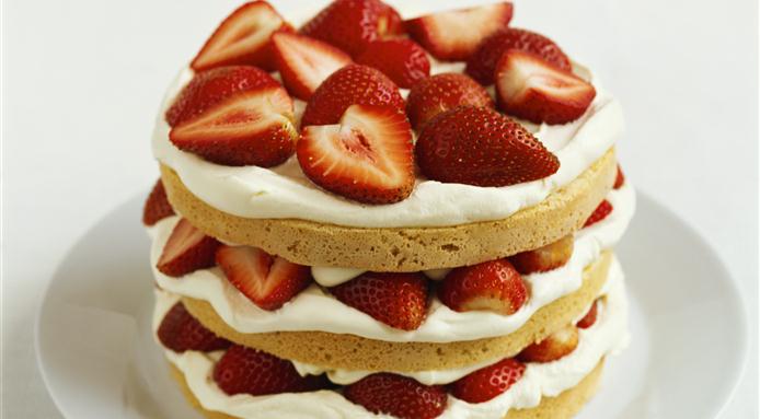 Pressione a última camada de torta, espalhe o chantilly restante e decore com as oito metades de morangos restantes.