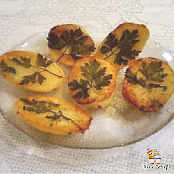 Unte um pirex generosamente com margarina e, a seguir, azeite, coloque as batatas com as folhas viradas para baixo e leve ao forno para assar até dourarem.