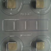 Depois de concluir os quatro nichos bata a forma levemente contra a mesa para que o ar saia. Coloque o silicone.E em seguida o encaixe dela. Estando nesta posição (foto abaixo) vire a forma de cabeça para baixo e leve à geladeira até que fiquem opacos mais ou menos 5 minutos.Retire delicadamente as caixinhas, removendo o silicone e as rebarbas. Mergulhe em 1mm a borda da caixinha na cobertura fracionada ou no chocolate e logo em seguida nos confeitos.
