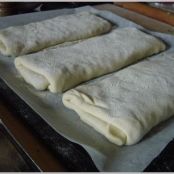 Abrir a massa com o rolo, espalhar o molho, dispor o presunto e o queijo, enrolar (embrulhar) e dispor em forma untada e polvilhada. Pincelar com gema batida com manteiga e assar em forno pré-aquecido.