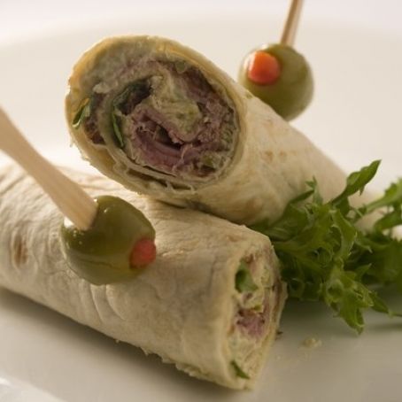 Para a montagem : abra os pães em uma superfície lisa e espalhe em um dos lados a pasta de azeitona. Distribua o tomate seco e o rosbife. Enrole o pão (começando pelo lado do recheio) apertando com suavidade, formando rolinhos. Corte os wraps em fatias e prenda cada uma com palitos.Decore com azeitona recheada com pimentão vermelho e azeite batido com escarola.