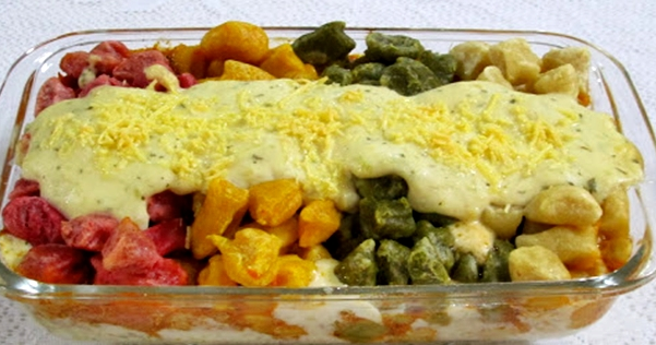 Arrume os nhoques coloridos a gosto, misturando-os ou colocando-os lado a lado e cubra com mais molho branco.