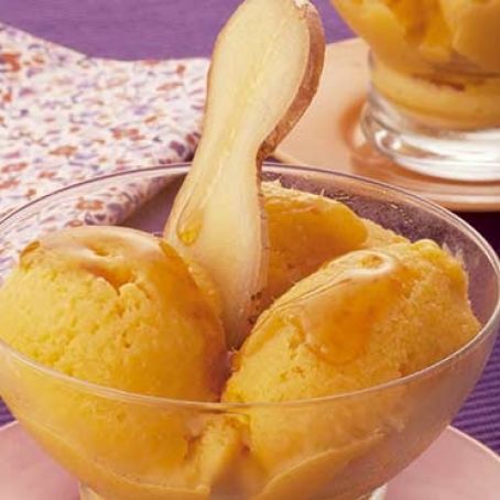 Leve ao congelador por seis horas ou até firmar. Na hora de servir, faça bolas com o boleador ou raspe com uma colher. Sirva regado com mel e decorado com fatias de gengibre.