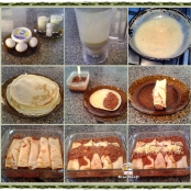 Coloco molho de tomate, com ou sem carne moida, em uma travessa, arrumo as panquecas e cubro com molho à bolonhesa ou branco e queijo parmesão ou provolone ralados.