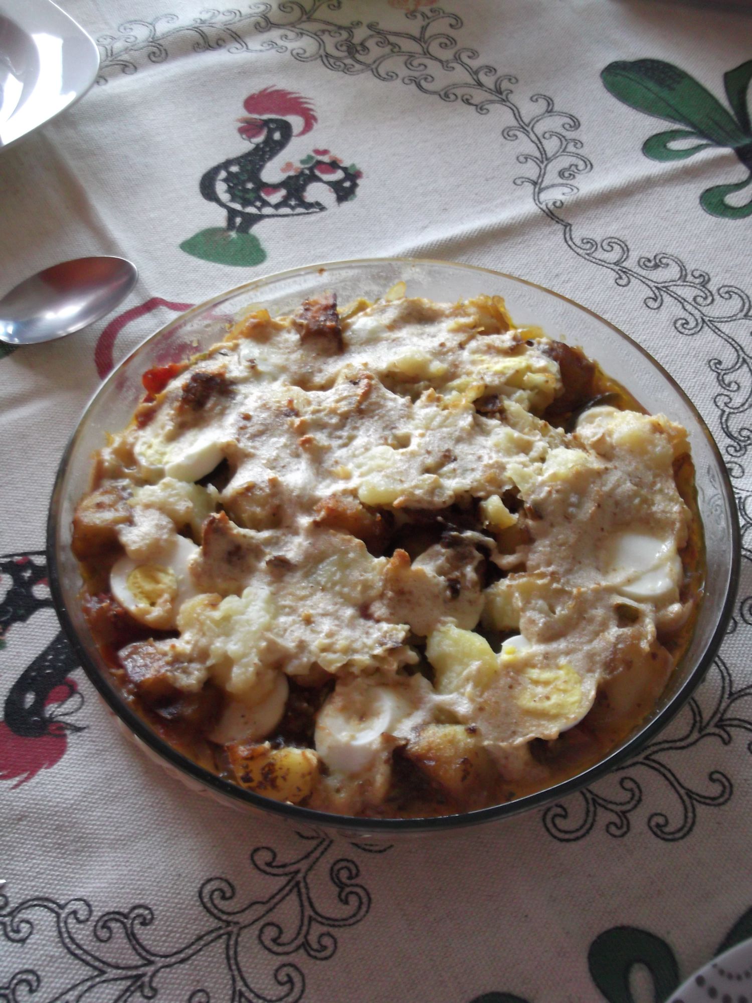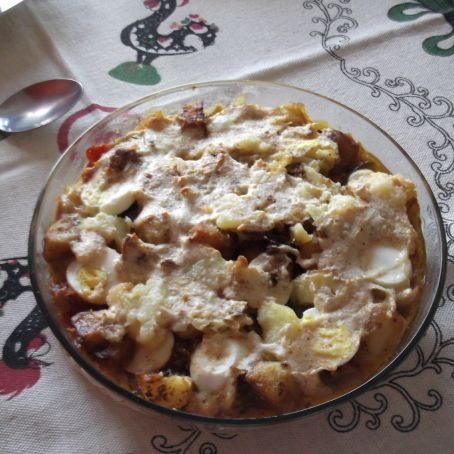Coloque metade do creme reservado, depois todo o refogado de bacalhau, o restante do creme, todo o refogado de palmito, os cubos de batatas cozidos e os ovos cozidos, cortados em rodelas.