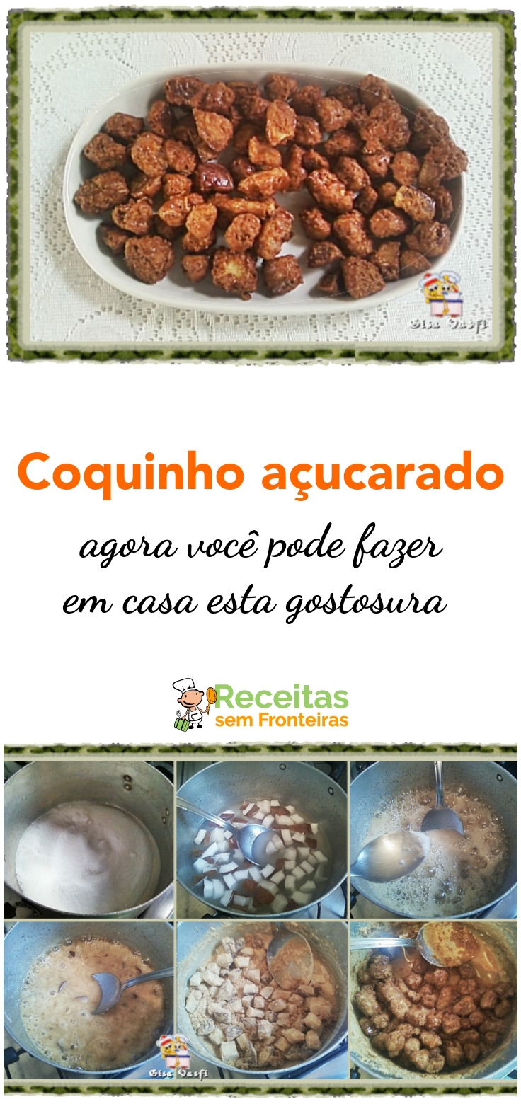 Como eu disse na introdução, se quiser a crosta de açúcar mais clarinha, retire a casquinha fina do coco porque ela solta pigmento durante o cozimento, deixando a calda de açúcar mais escura.